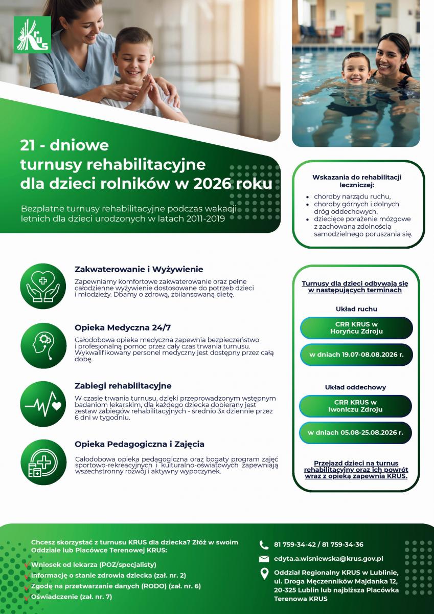 21-dniowego bezpłatnego turnusu rehabilitacyjnego dla dzieci rolników w 2026 r.