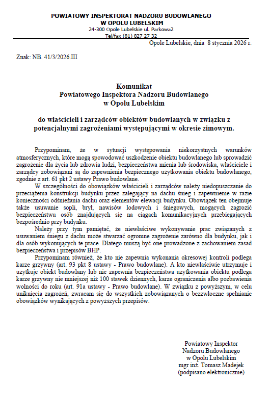 Komunikat Powiatowego Inspektora Nadzoru Budowlanego w Opolu Lubelskim